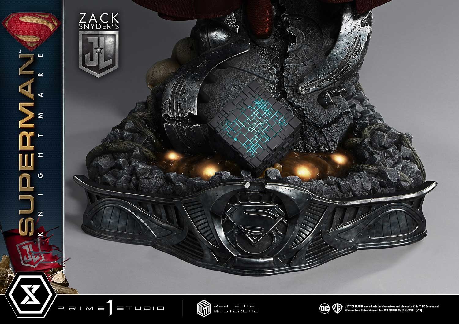 The specially designed base, equipped with LED light-up features, evokes the Kryptonian ship where Superman’s resurrection took place. The glowing amniotic fluid, reminiscent of Superman’s rebirth chamber, and the ethereal light of the Mother Box create a mysterious and otherworldly atmosphere. Heavy metallic details and skull motifs enhance the solemn and powerful mood.